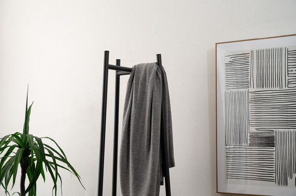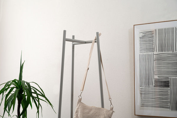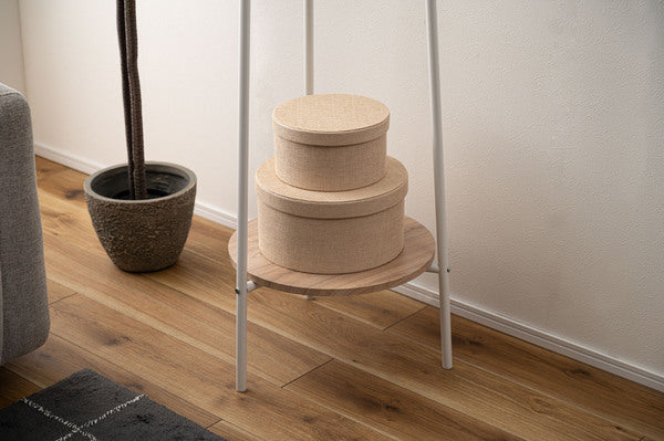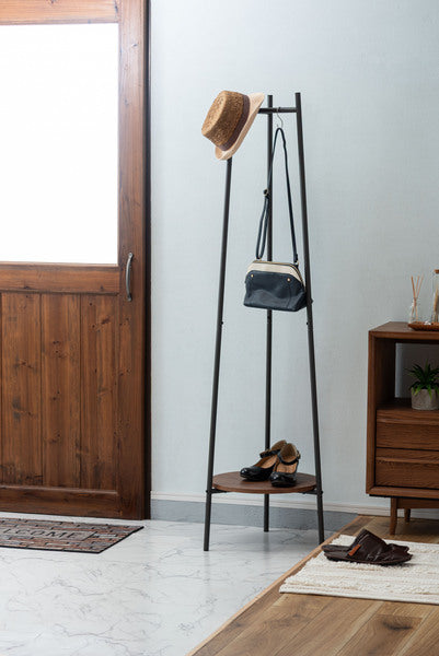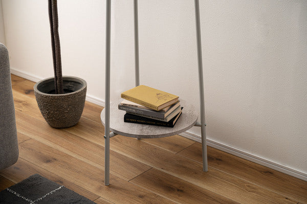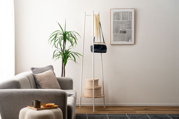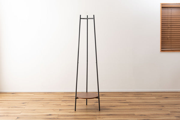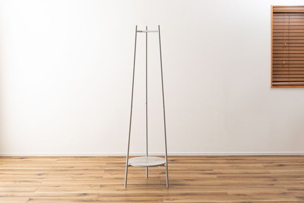 3本のスチール脚で支えるミニマルな構造が特徴のハンガー。美しい木目調 石目調の棚板を組み合わせ、様々なテイストと調和するデザインに仕上げました。衣類を収納するだけでなく、小物を魅せるディスプレイ台としても使えるため多様なシーンで活躍します。スリムながら安定感があり、空間を引き締めるアクセントにもなります。