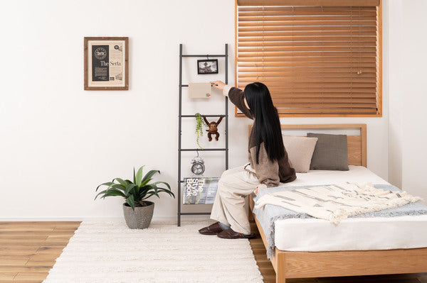 シャープですっきりとしたラダーハンガー スリムな形状でスタイリッシュなデザインのラダーハンガー。空間に馴染み、場所を取らない形状のため様々なシーンで活躍します。ブランケットやお気に入りの服、小物を品よく魅せながらかけることができます。