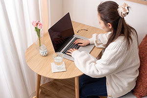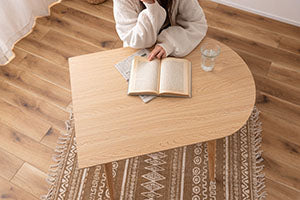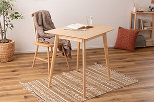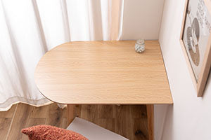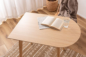 一辺に曲線を取り入れたやさしいフォルムで、凹凸のない滑らかなホワイト天板と、天然木の脚の組み合わせが可愛らしさを演出してくれます。